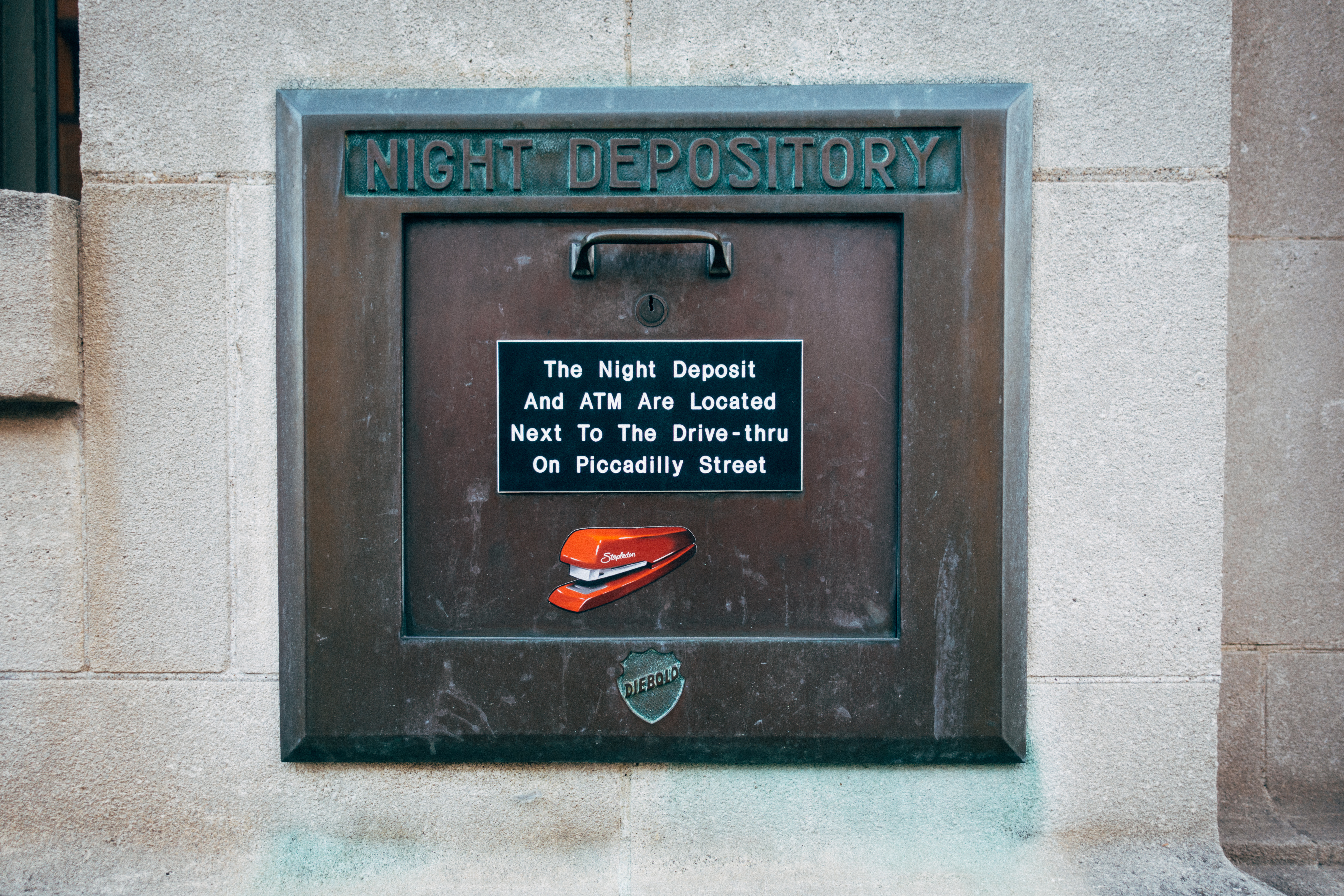 The photograph captures a bronze night depository mounted on a textured stone wall, exuding an industrial charm. A small red stapler attached to the notice adds a quirky touch, contrasting with the serious tone of the sign detailing ATM location. Soft lighting enhances the subtle textures of the materials, creating a calm urban atmosphere that invites contemplation.