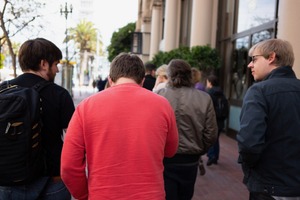 A group of individuals walks side-by-side along a bustling urban street, their backs turned to the camera. The scene is filled with a casual camaraderie, highlighted by warm afternoon light that casts soft shadows, enhancing the relaxed atmosphere of the stroll. The composition draws the viewer's eye down the line of figures, evoking a sense of connection and shared experience in the heart of the city.