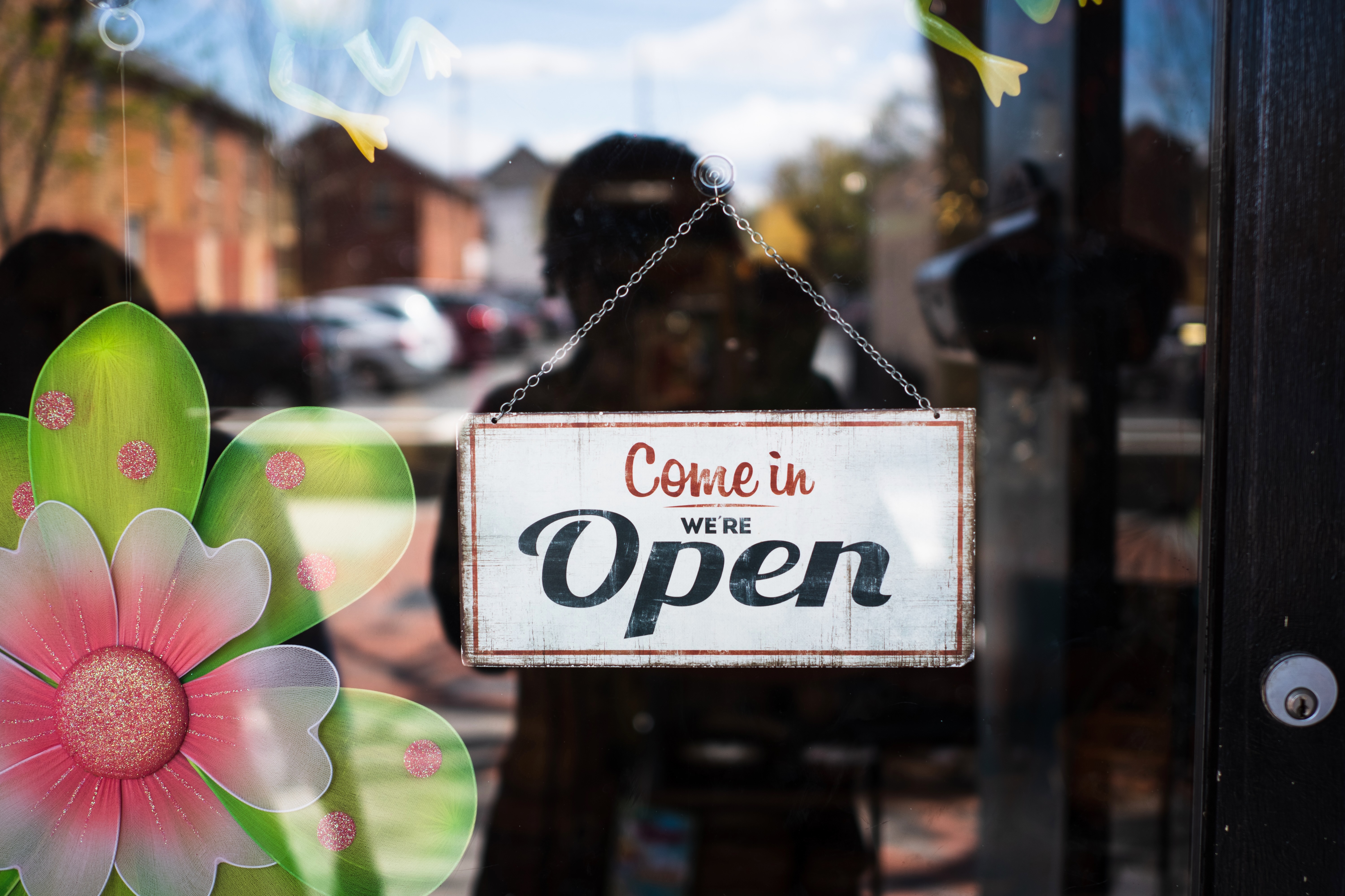 A charming 'Open' sign hangs invitingly in a window, surrounded by vibrant flower decorations that enhance the cheerful atmosphere. Soft natural light streams in, illuminating the scene and casting a warm glow, while a hint of a reflection adds depth. The overall composition evokes a sense of welcoming and community, inviting patrons to step inside.