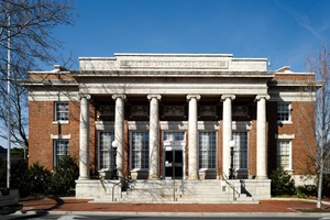 The photograph captures a grand, historic post office building, characterized by its imposing columns and classic architectural details. Bathed in bright daylight, the structure exudes a sense of both dignity and nostalgia, inviting the viewer to reflect on its storied past. The clean lines and vibrant blue sky enhance the compositional harmony, creating a striking visual impact.