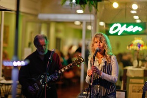 In a cozy setting, a woman stands at the microphone, her expression full of passion as she sings, while a guitarist strums softly beside her. The warm lighting and the vibrant 'Open' sign create an inviting atmosphere, highlighting the connection between the performers and their audience. The blurred background, filled with patrons enjoying the live music, further enhances the intimate vibe of the scene.