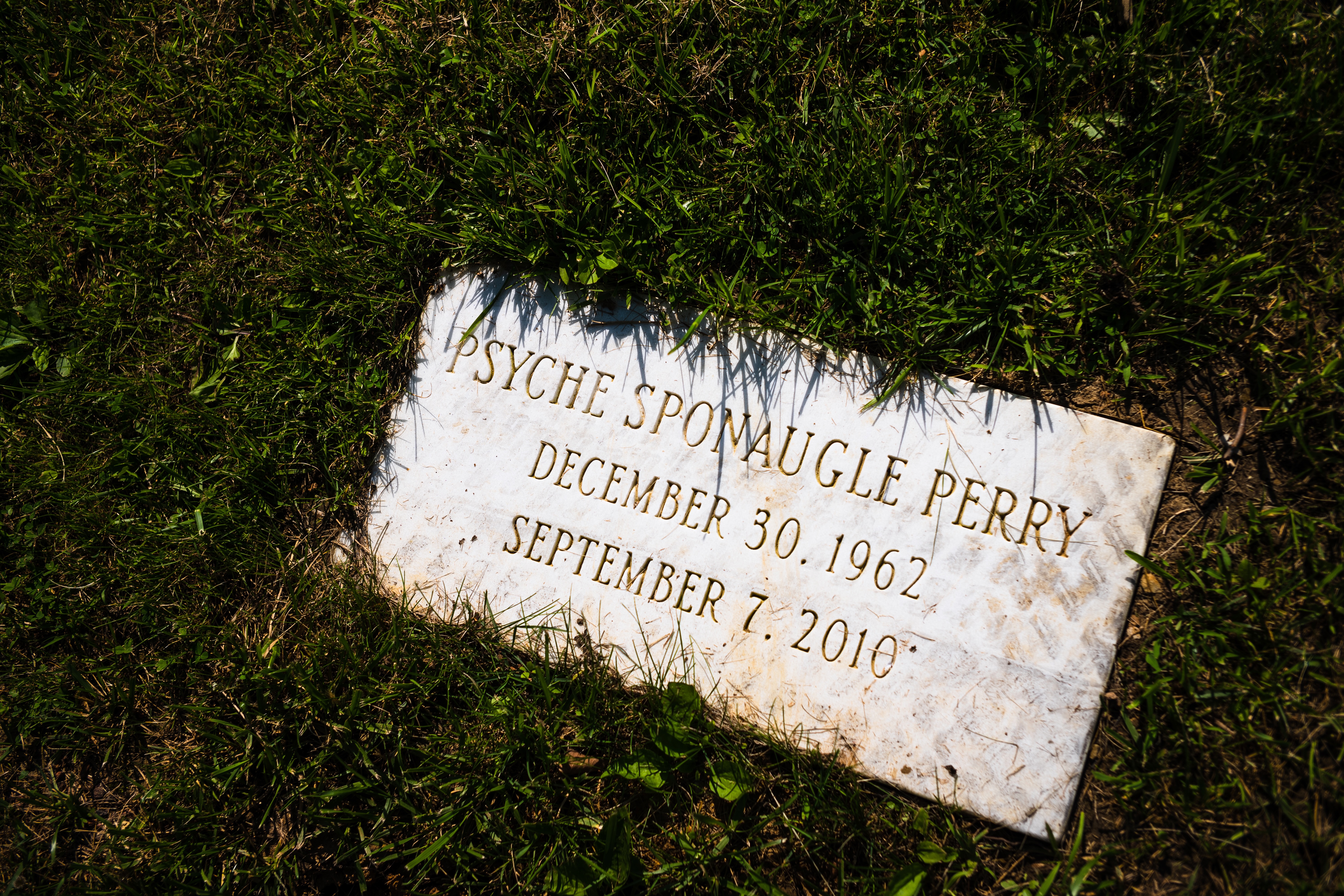 The photograph captures a simple gravestone nestled in the grass, its white marble surface glowing under soft sunlight. The engraved name and dates are partially obscured by blades of grass, evoking a sense of quiet nostalgia and loss. The overall mood is contemplative, inviting reflections on life and memory amidst the serene burial ground.