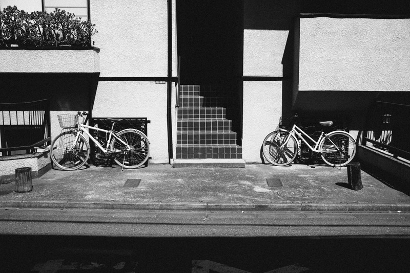 This photograph captures a quiet urban scene, highlighting two bicycles casually parked beside a set of steps leading into a building. The stark contrast of light and shadow creates a mood of tranquility, while the monochrome tones emphasize the simplicity and stillness of everyday life. The composition invites viewers to reflect on the serene space that exists within a bustling city.