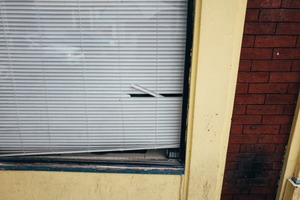 The photograph captures a broken window framed by vibrant yellow paint and rustic brick, creating an intriguing juxtaposition of decay and color. The worn blinds hang unevenly, suggesting a story of abandonment or neglect, while soft light filters through, evoking a sense of melancholic curiosity. The composition draws the eye to the cracks and lines, inviting contemplation of the space behind the glass.