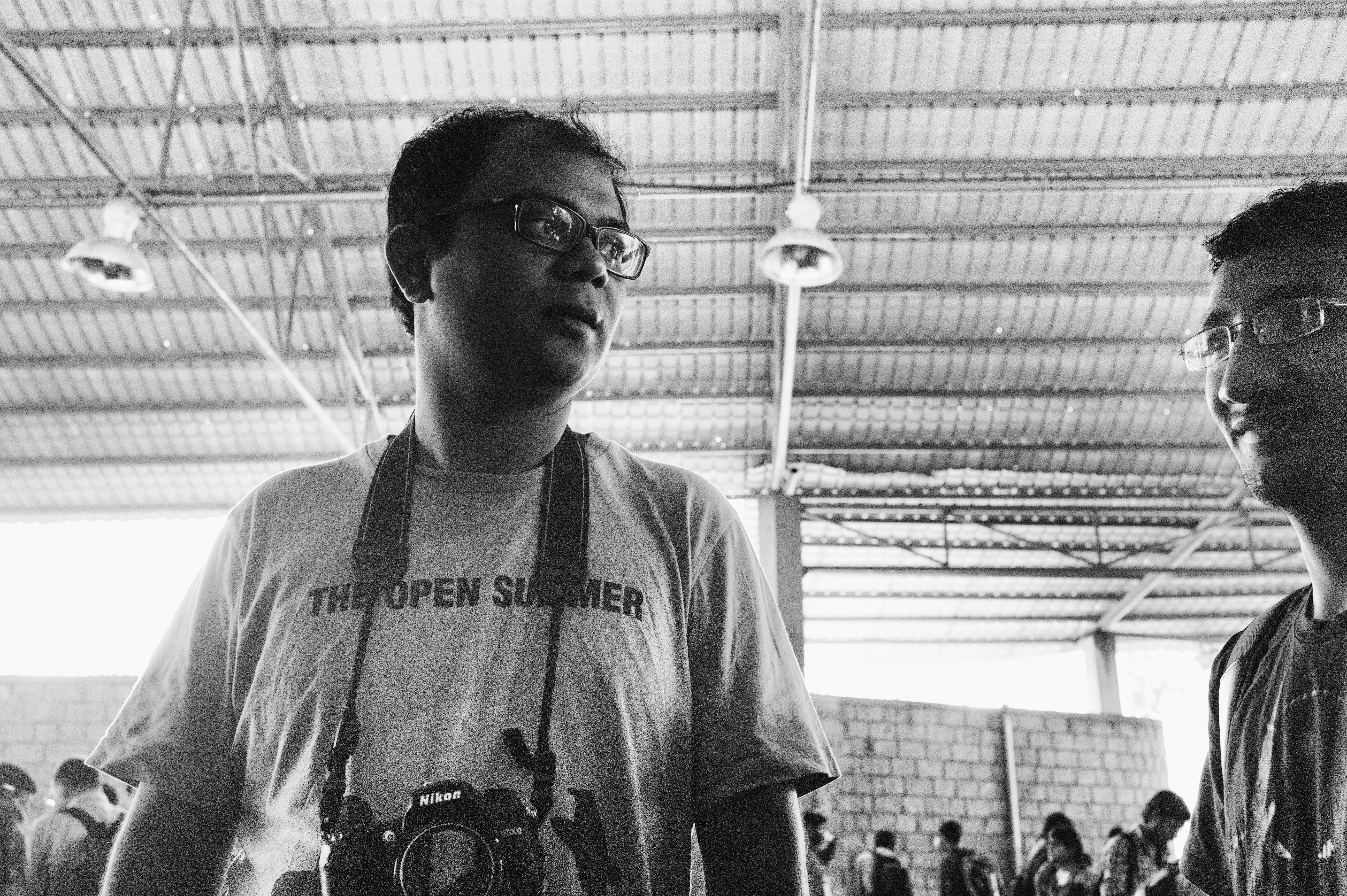 In a bustling venue, two men engage in conversation, their expressions a blend of curiosity and camaraderie. The black-and-white tone accentuates shadows and highlights, creating a nostalgic atmosphere, while natural light filters in from above, softly illuminating their faces amidst the crowd. The composition draws the viewer's attention to their interaction, revealing a moment of shared understanding in a lively environment.