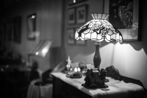 This photograph captures a vintage lamp with an intricate stained glass shade, casting a warm glow amid a dimly lit room filled with framed memories. The soft focus and monochrome palette evoke a sense of nostalgia, inviting viewers to reflect on treasured moments of the past. The thoughtfully arranged objects on the table harmonize with the atmosphere, creating a cozy, intimate scene.