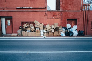 In front of a brick wall painted red, a chaotic pile of cardboard boxes and trash bags sprawls across the pavement, highlighting urban neglect. The lighting captures the stark contrast of the dark refuse against the vibrant background, evoking a sense of desolation. The composition leads the viewer's eye along the street, allowing a moment of reflection on the remnants of city life.