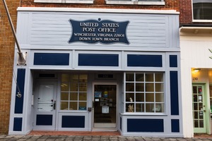 The photograph captures the inviting facade of a downtown post office in Winchester, Virginia. Soft, natural light illuminates the structured lines and classic design, evoking a sense of nostalgia and community. The crisp blue and white color scheme contrasts subtly with the warm brick surroundings, enhancing the charm of this local landmark.