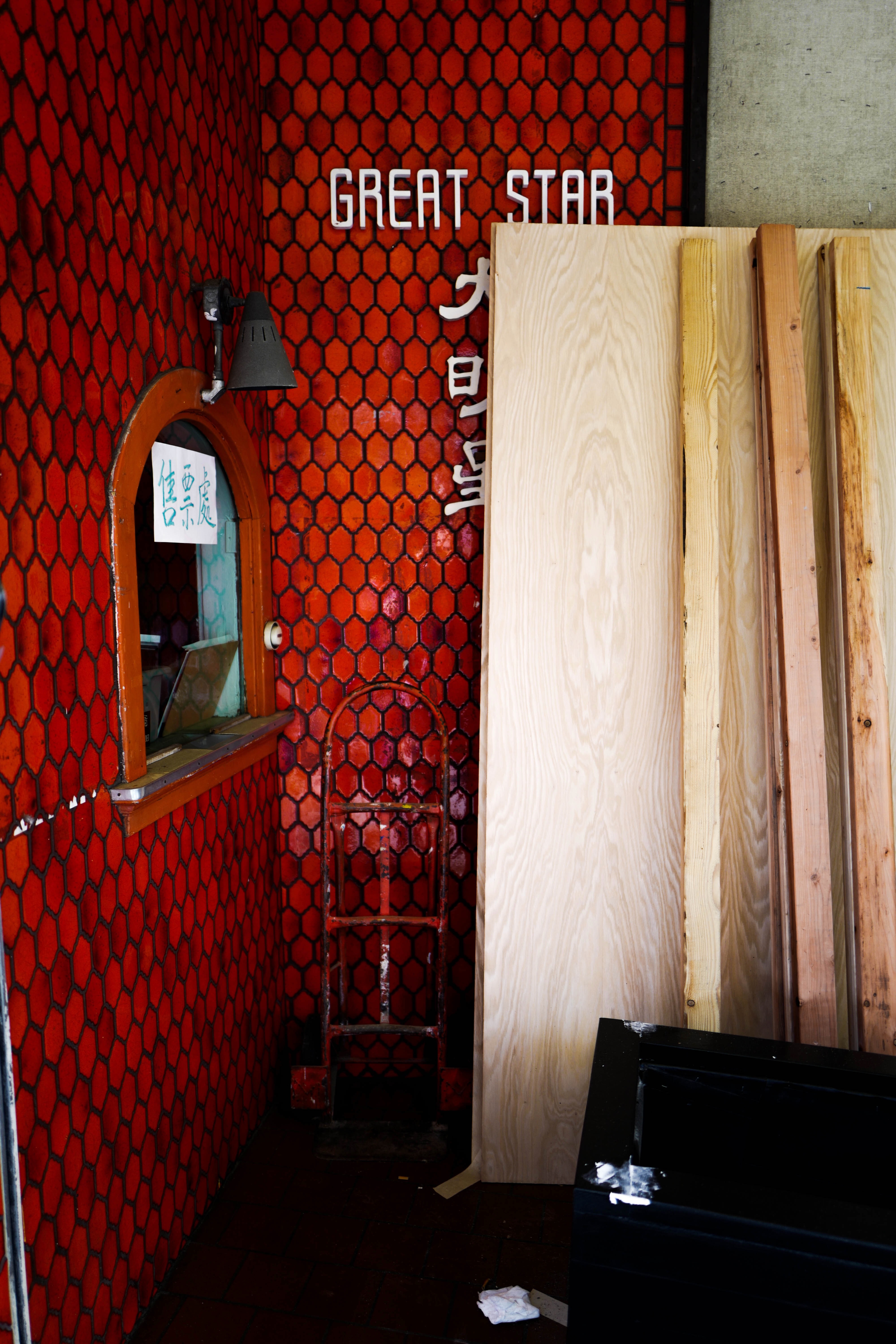This photograph captures a quaint urban nook, flanked by vibrant red honeycomb-patterned walls. A lone window inset reveals a glimpse of forgotten charm, while stacks of wooden planks lean against the wall, adding an element of intrigue and continuity. The interplay of warm lighting illuminates the textures, creating a nostalgic and slightly melancholic mood.