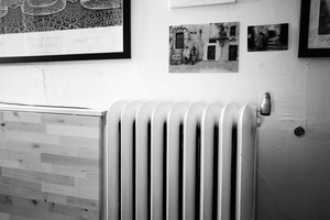 This photograph captures a simple yet evocative interior scene, featuring an ornate radiator against a textured wall adorned with framed photographs. The monochrome palette imbues the space with a nostalgic mood, while the soft lighting highlights the contrasts between the sleek wooden panel and the vintage elements above. The composition draws the eye along the horizontal lines, creating a sense of calm and inviting contemplation.