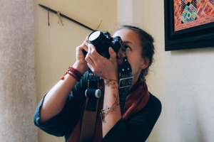 In this intimate photograph, a woman is deeply engaged in capturing the world through her camera, her focused gaze hinting at her passion for photography. The warm, natural light softly illuminates her features, enhancing the rich textures of her attire and the creative environment around her. The framing showcases the delicate balance between her figure and the artistic backdrop, suggesting a narrative filled with creativity and exploration.