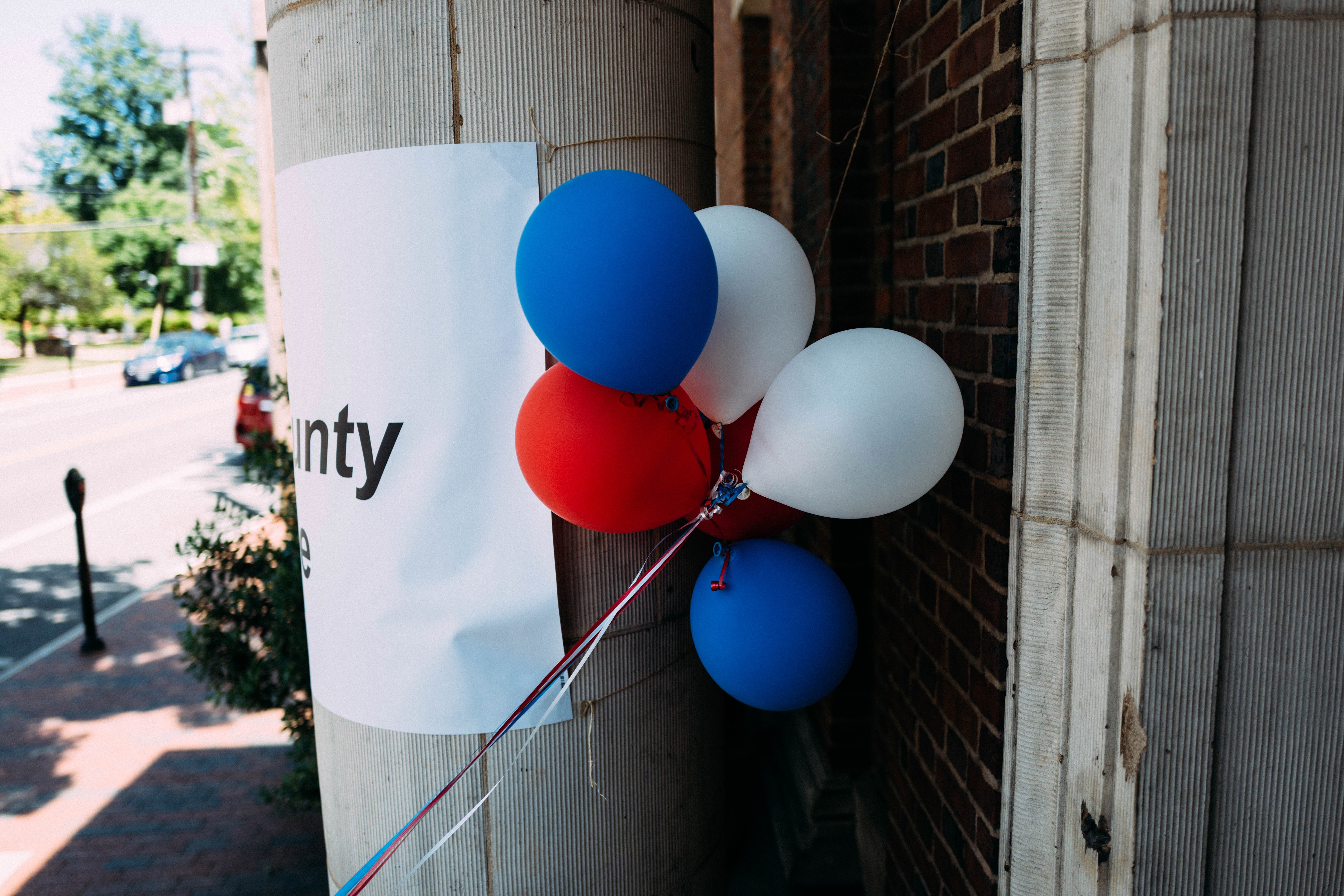 A cluster of vibrant red, white, and blue balloons leans against a textured pillar, capturing a spirit of celebration. The soft sunlight casts gentle shadows, enhancing the colors while hinting at a festive atmosphere. In the background, a hint of urban life adds context, evoking a sense of community and anticipation.