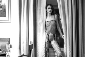 In a striking black-and-white composition, a figure clad in a daring fishnet outfit stands poised between curtains, exuding both vulnerability and confidence. The soft, diffused lighting casts gentle shadows, enhancing the mood of intimacy and intrigue. The juxtaposition of the figure against the muted background elements creates a compelling sense of tension and allure.