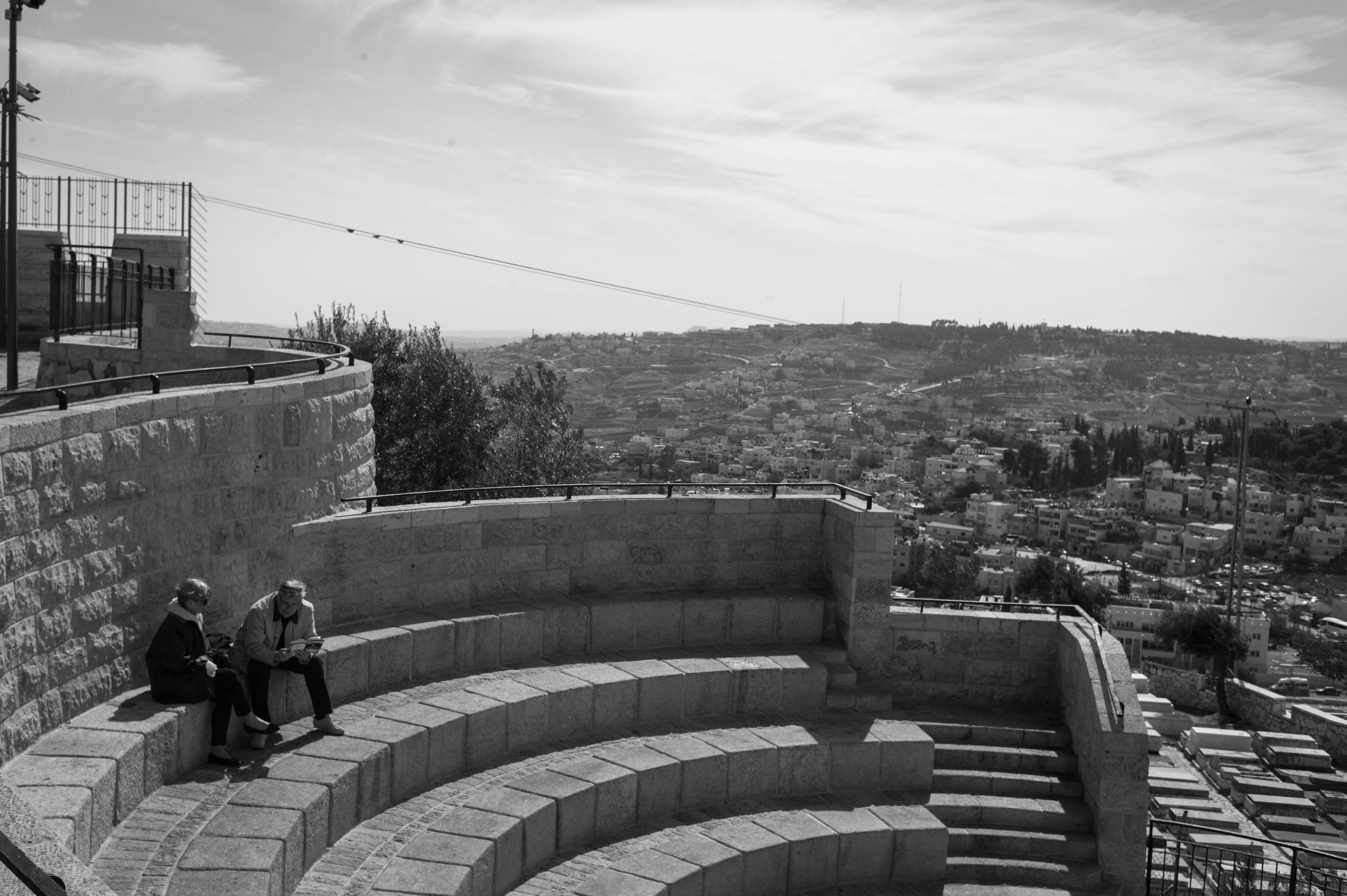 In this black-and-white photograph, two figures sit on a circular stone bench, immersed in their own contemplations. The sweeping view of the distant cityscape adds a sense of depth, while the soft, diffused light enhances the serene atmosphere. The composition draws the eye towards the subjects, creating a moment of quiet intimacy against the expansive backdrop.