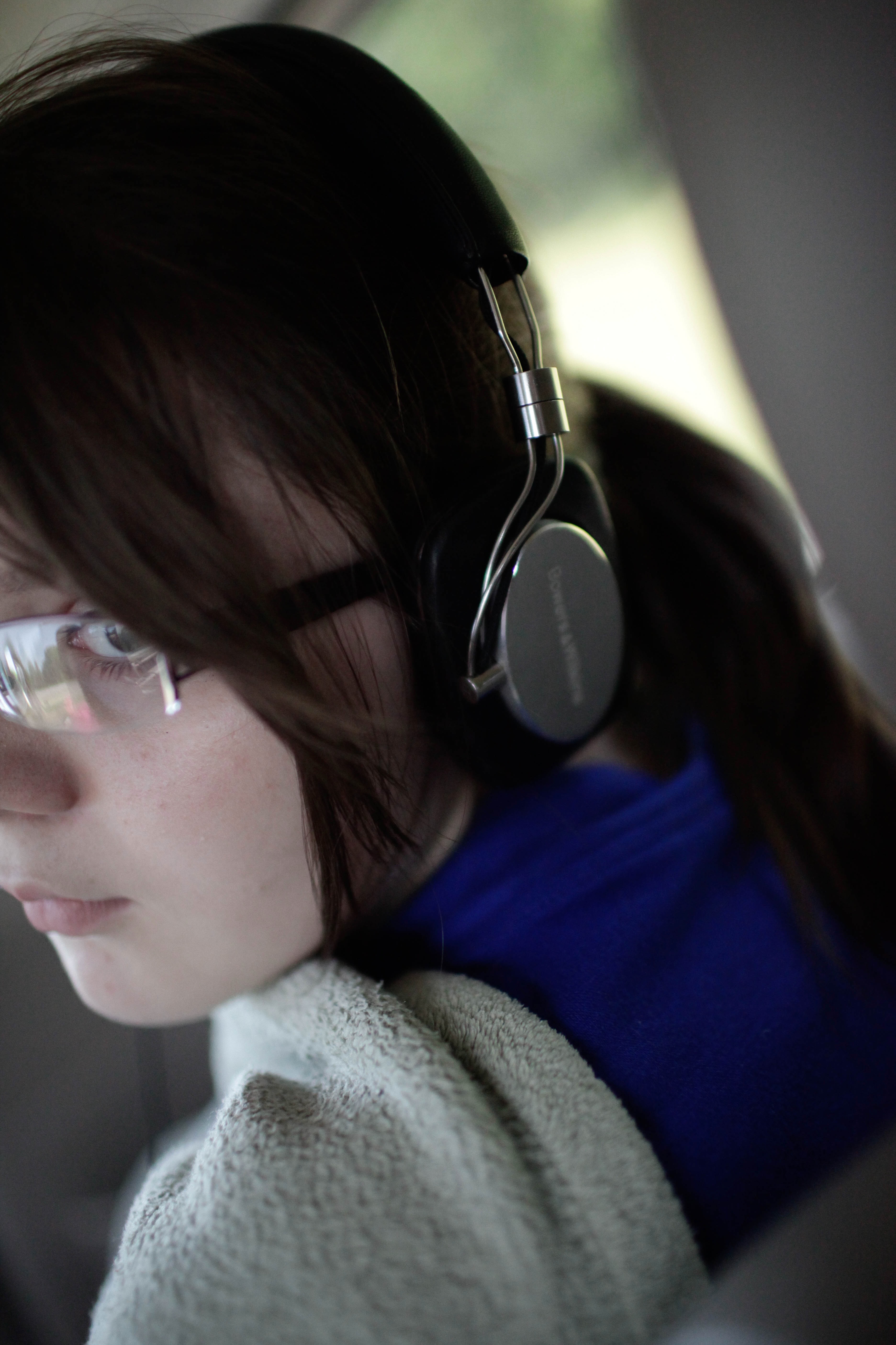 A young woman gazes pensively towards the camera, her expression hinting at introspection. The soft focus and dim interior lighting create a serene, almost contemplative atmosphere, while her headphones suggest immersion in music or thought. Draped in a blanket, she embodies a moment of stillness amidst the motion of travel.