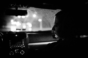 In this atmospheric black-and-white photograph, a woman's profile is softly illuminated against a backdrop of blurred streetlights, creating an intimate and contemplative mood. The dimly lit interior of the car contrasts with the ethereal glow outside, inviting a sense of solitude and reflection. The composition, framed by the car's dashboard and window, adds an element of mystery to the scene, evoking the feeling of a quiet journey through the night.