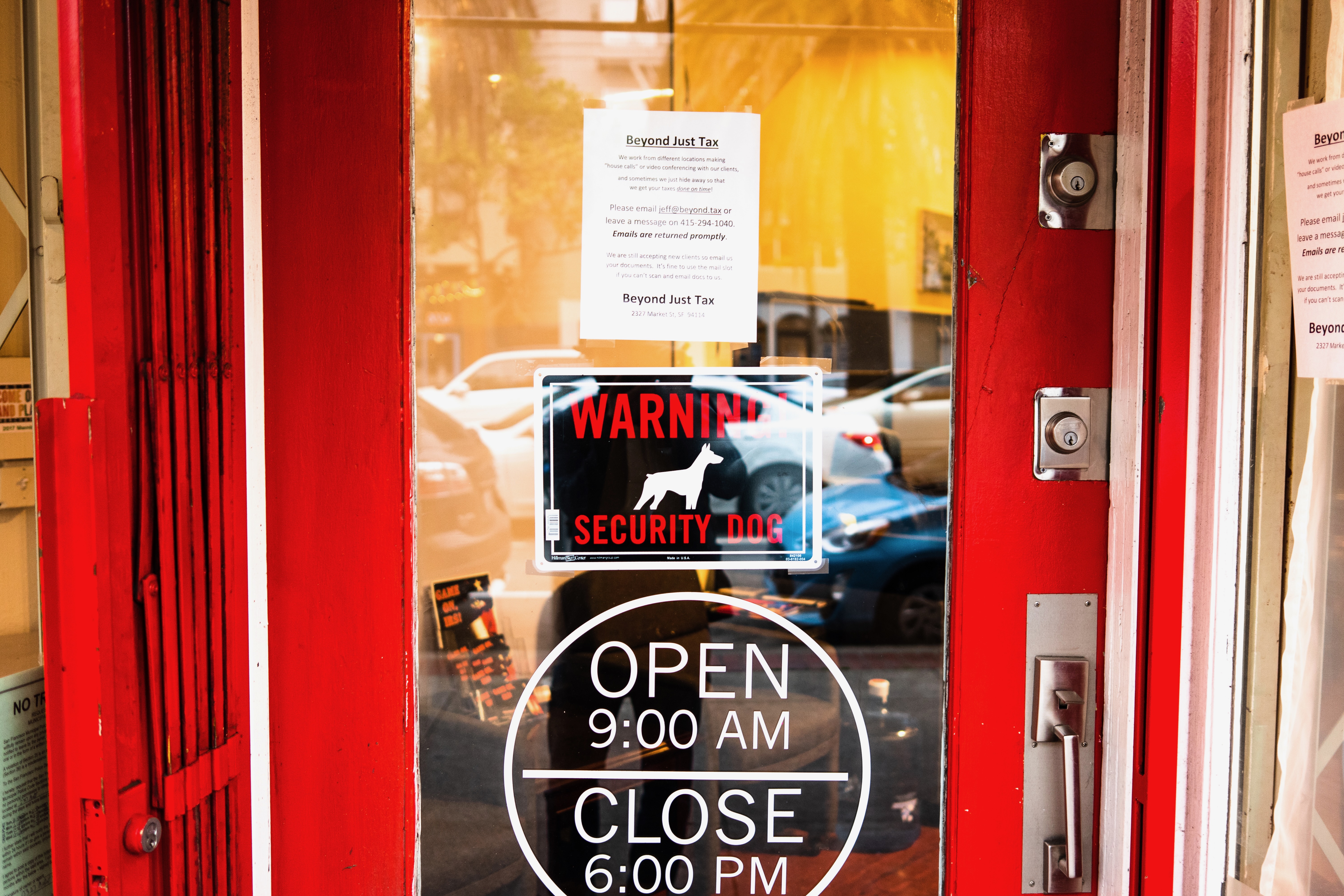 The photograph captures a vibrant red door with prominent signage announcing business hours and a warning for a security dog. Sunlight filters through the glass, creating a warm and inviting atmosphere while hinting at the bustling activity just outside. The composition blends friendliness with a hint of caution, inviting curiosity while setting clear boundaries.