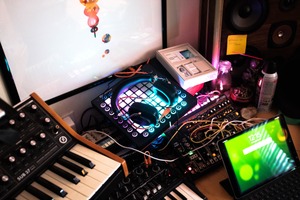 The photograph captures a bustling workspace filled with electronic music equipment, each piece reflecting a creative, vibrant energy. Soft, multicolored lighting bathes the instruments and headphones, creating an inviting atmosphere that beckons exploration. The cluttered composition suggests an artist deep in the process of creation, where technology and imagination intertwine.