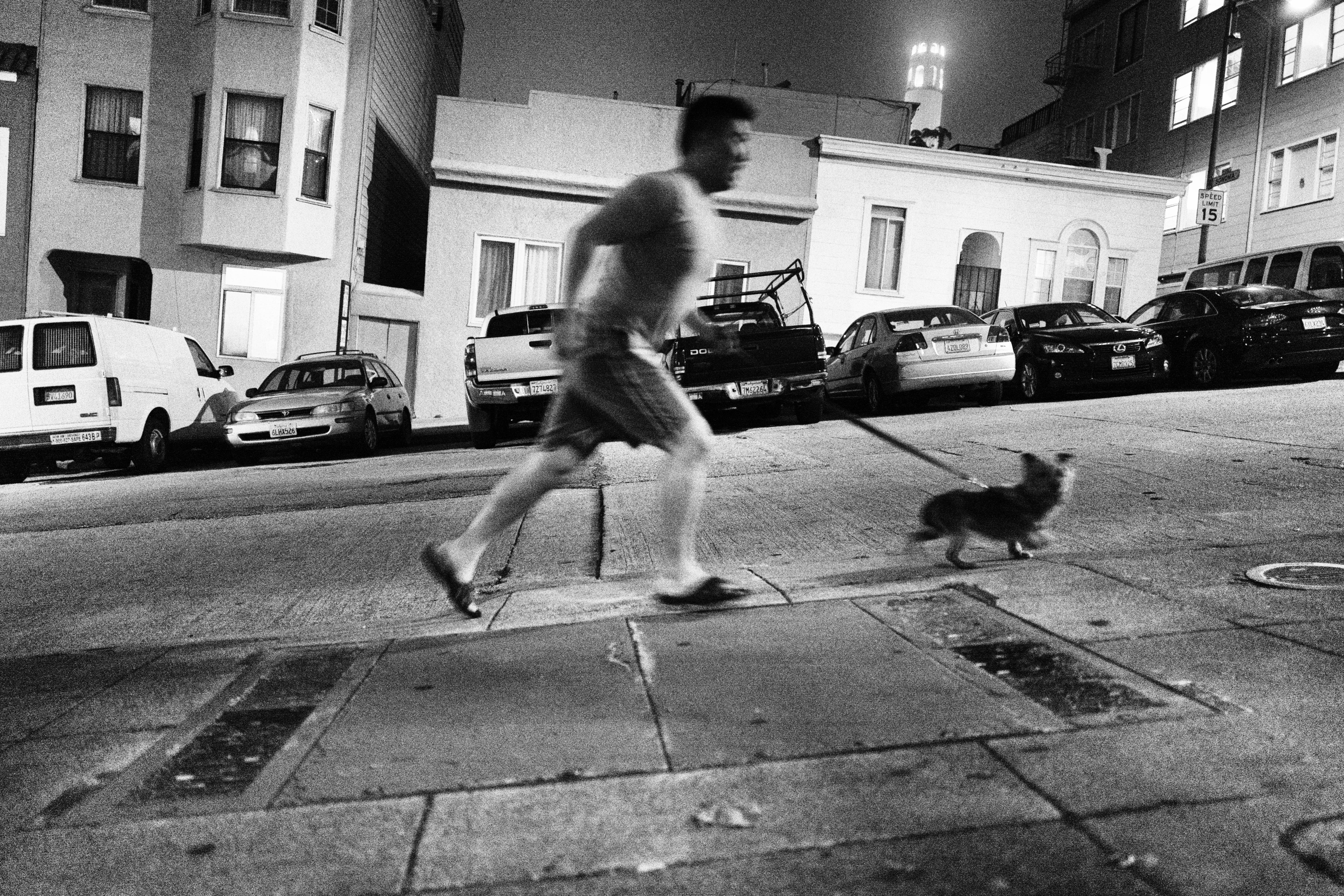The photograph captures a dynamic scene of a man jogging with a dog along a steep urban street at night. The soft glow from nearby streetlights casts a moody ambiance over the moment, while the black-and-white tones emphasize the fleeting movement and create a sense of urgency. The uneven pavement and parked cars frame the action, enhancing the intimacy of this nocturnal outing.