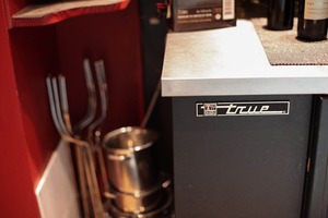 This intimate photograph captures a corner of a well-equipped kitchen featuring a sleek metal countertop contrasted against deep red walls. The scene is enhanced by soft, ambient lighting that creates a cozy atmosphere, inviting a sense of warmth and culinary creativity. Tools and bottles arranged neatly suggest a space ready for gastronomic exploration and enjoyment.