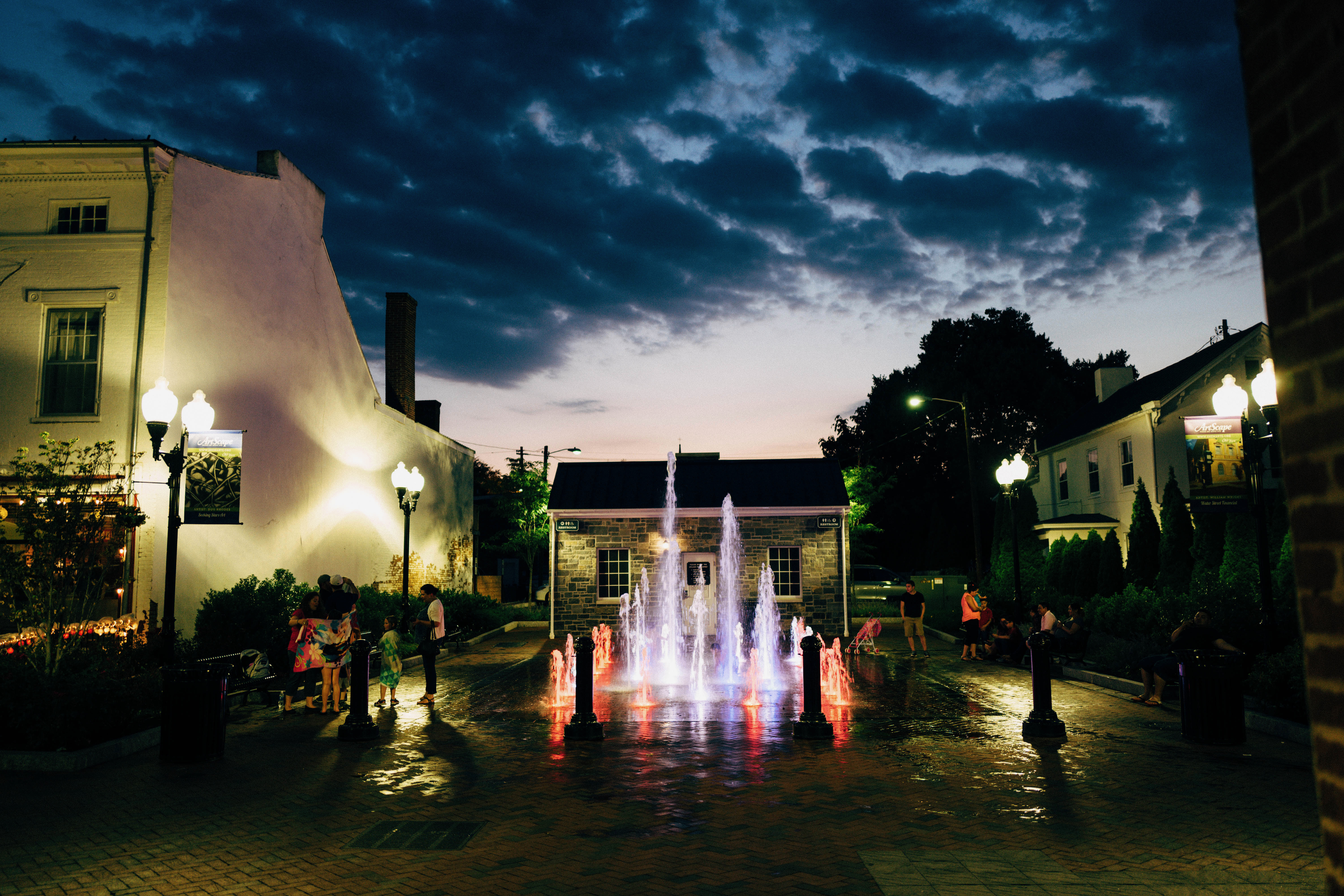 In this vibrant scene, a jet of water erupts from a fountain, illuminated by dancing colored lights against a dramatic sky. The composition features playful figures gathered around the fountain, creating an atmosphere of joy and community. Soft lamplight casts a warm glow, adding to the enchanting twilight mood of the space.