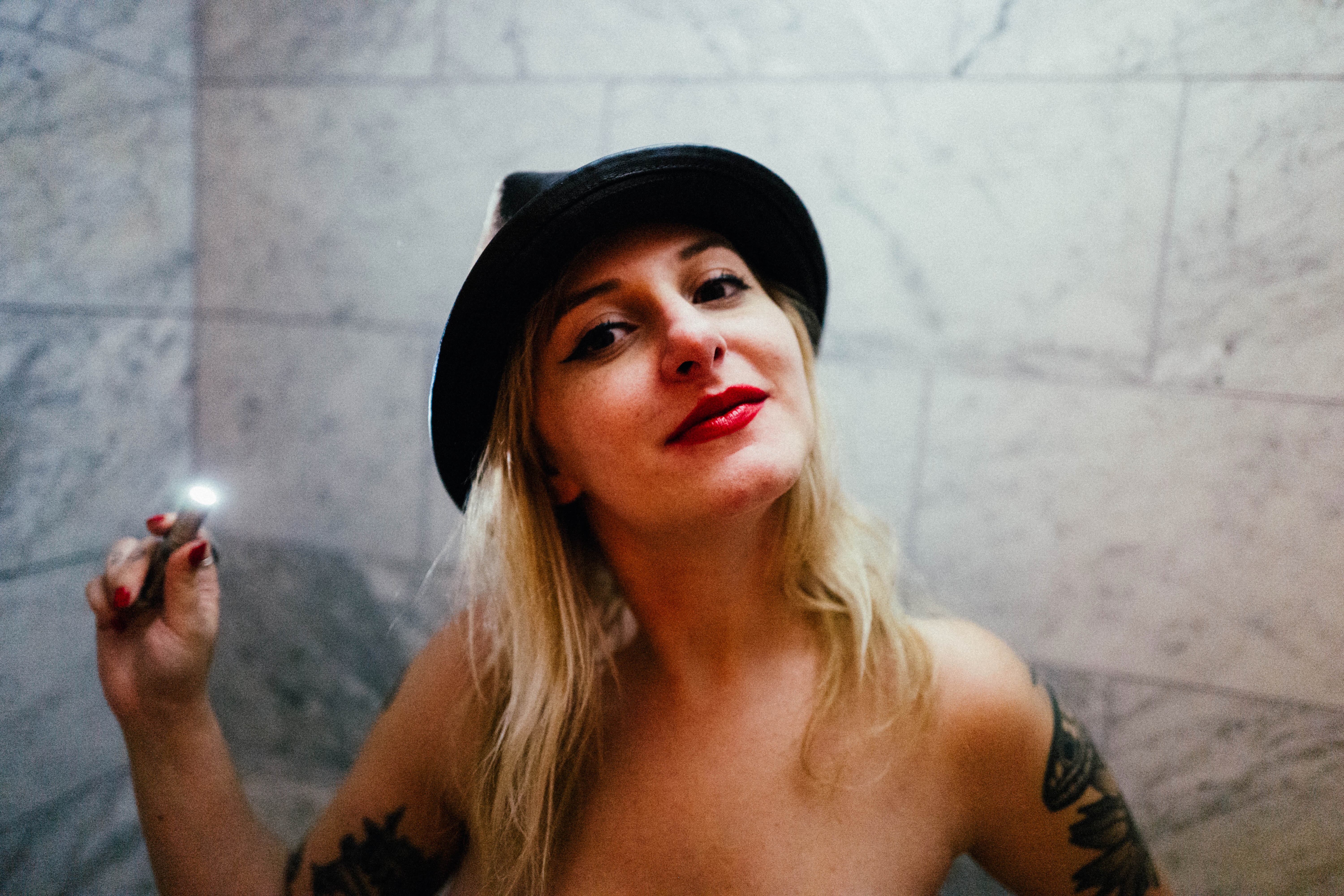 The photograph captures a woman exuding confidence in a moody, dimly lit setting. Her playful expression is highlighted by striking red lips and a stylish black hat, contrasting against the soft marble background. The overall atmosphere conveys a sense of intimacy mixed with a hint of rebellion, enhanced by the soft, ambient light accentuating her features and tattoos.