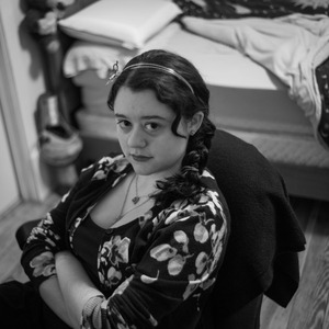 In a striking monochrome composition, a young woman sits with arms crossed, her expression revealing a mix of contemplation and defiance. The soft, diffused light highlights her features and the intricate details of her attire, while the blurred background suggests a personal space filled with comfort and familiarity. The contrast of dark and light amplifies the mood of introspection, inviting viewers to ponder her thoughts.