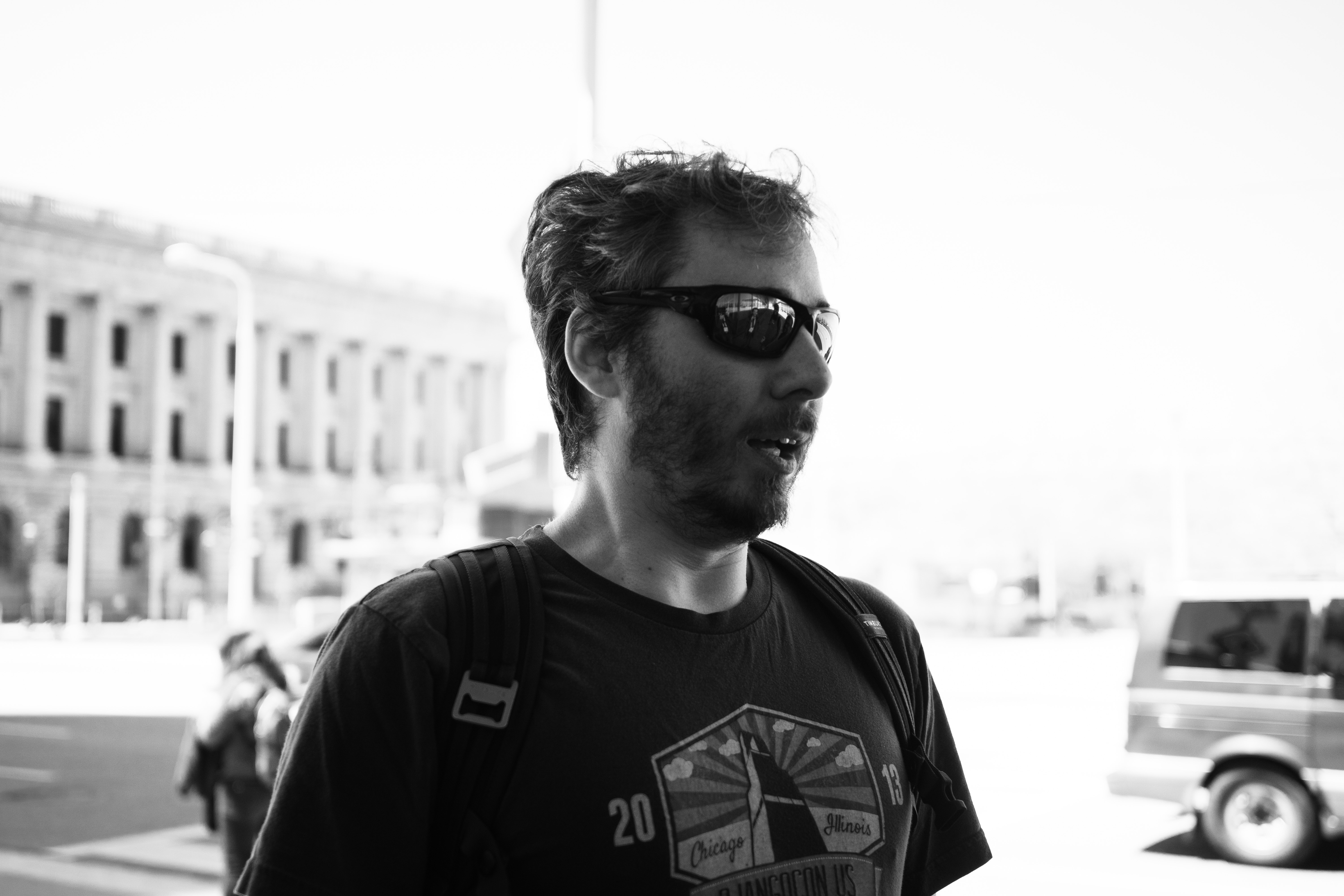 The photograph captures a man wearing sunglasses, seemingly engaged in conversation, against a sharply contrasting urban backdrop. The play of light and shadow creates a moody atmosphere, enhancing the candid moment in this black-and-white setting. With a slightly blurred crowd behind him, the focus remains on his expression, evoking a sense of spontaneity and urban life.