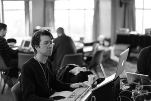 In a softly lit space, a man sits at a desk, intensely engaged with his computer while surrounded by the muted activity of others. The black-and-white composition highlights the concentration on his face and the myriad of tech paraphernalia around him, evoking a sense of creative collaboration. Natural light filters in through large windows, adding a gentle, contemplative mood to the bustling environment.