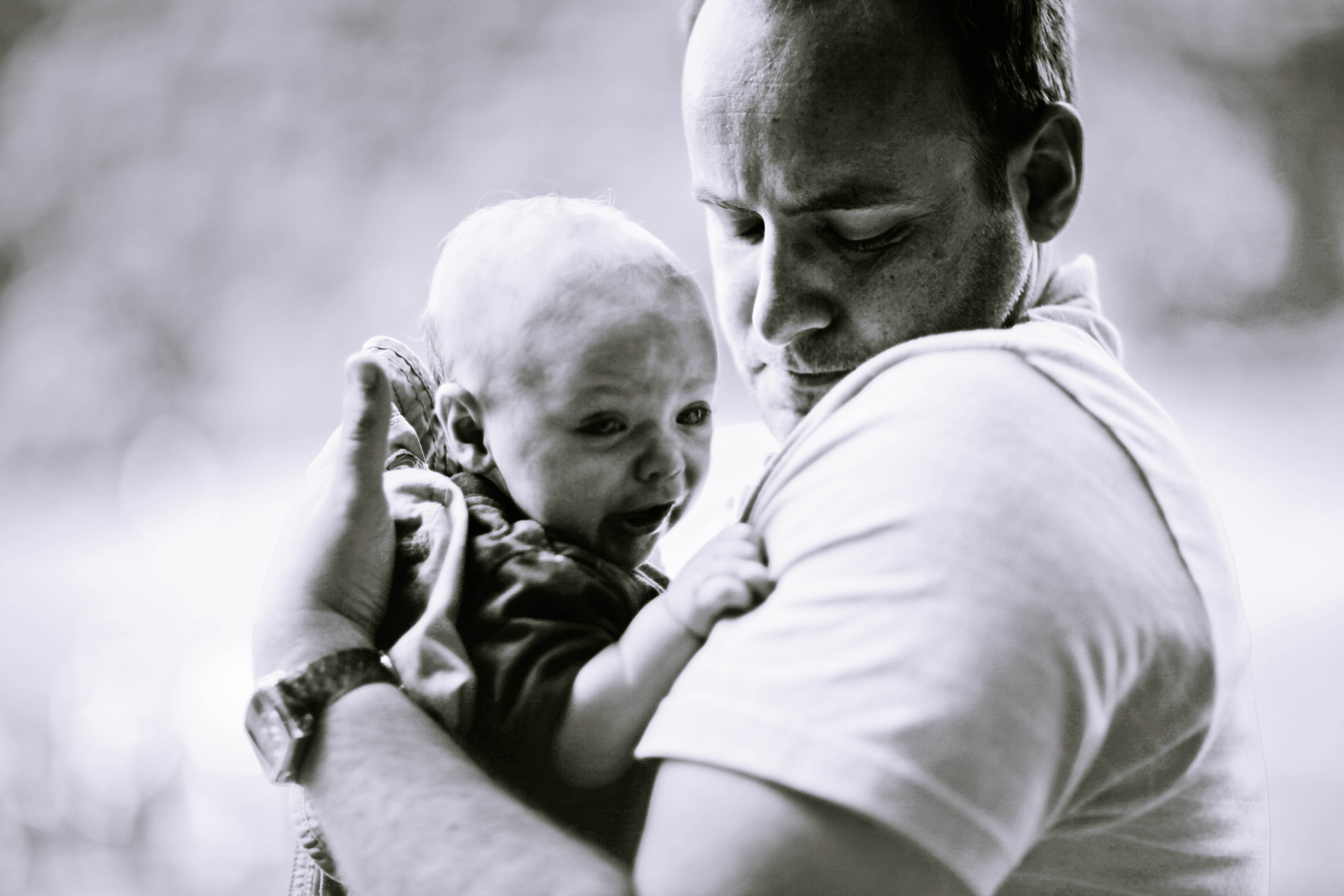 In this intimate photograph, a father cradles his crying baby, capturing a moment of vulnerability and deep emotional connection. The soft focus and desaturated tones enhance the mood, creating a poignant sense of tenderness amidst the chaos of parenthood. The composition draws the viewer's eye towards their faces, highlighting the contrast between the father’s calm demeanor and the baby's distress.