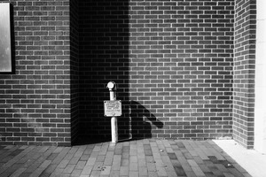 The photograph captures a solitary fire hydrant standing against a stark, textured brick wall, emphasizing its isolation within an urban landscape. Natural light casts a long shadow that adds depth and interest, while the monochrome palette evokes a sense of grit and melancholy. The composition invites viewers to reflect on the often unnoticed elements of city life, balancing between the mundane and the significant.