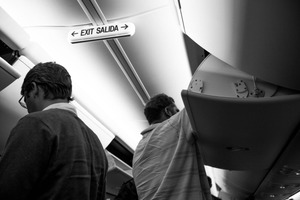 In this intimate black-and-white photograph taken inside an airplane, two figures are captured mid-action, one adjusting his clothing while the other concentrates on retrieving an item from an overhead compartment. The overhead sign indicating the exit adds a layer of urgency, while the soft, diffuse lighting creates a contemplative atmosphere. The composition emphasizes the closeness of the subjects, accentuating the shared experience of travel and momentary connection in an enclosed space.