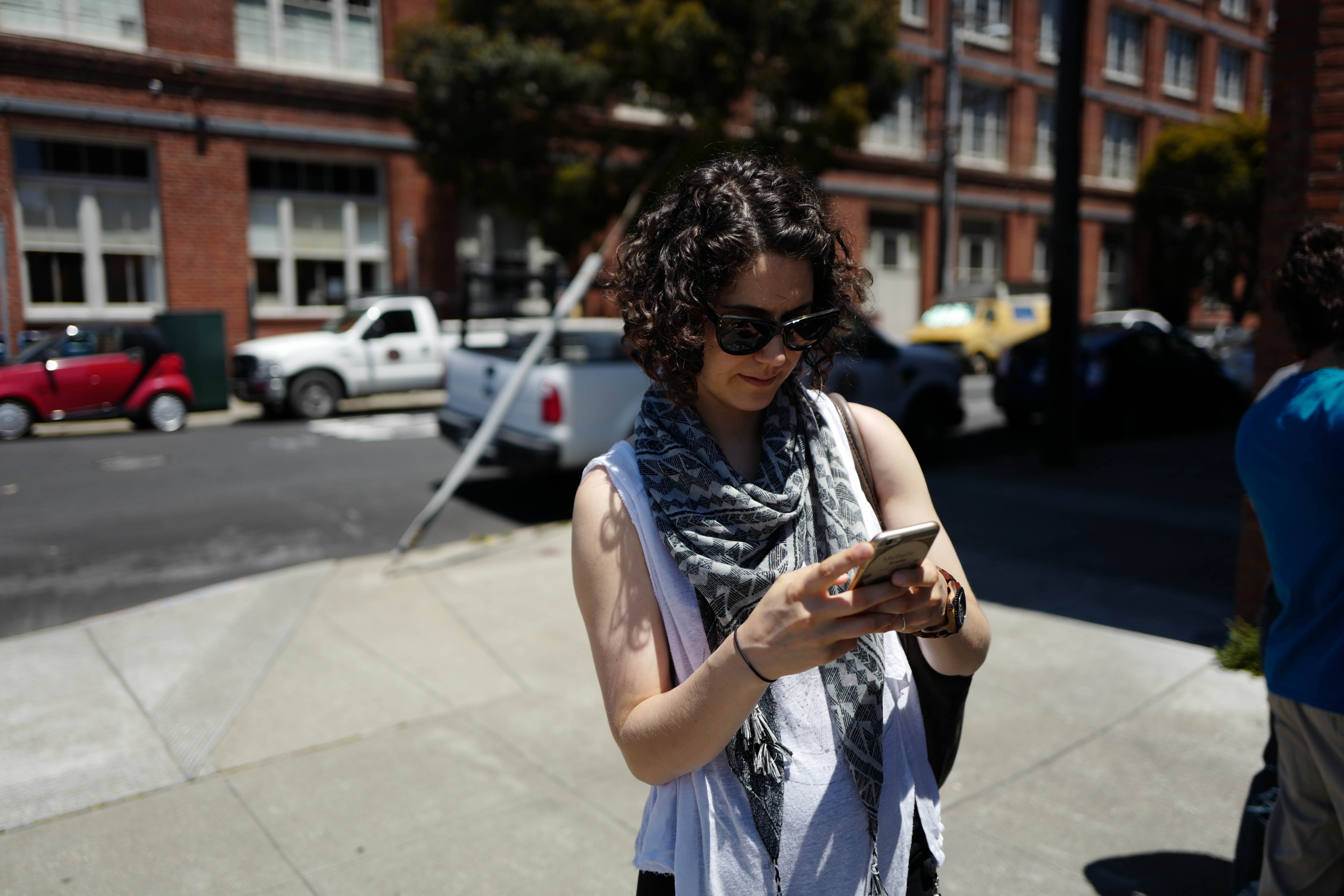 A young woman stands casually on a sunlit street, engrossed in her phone, encapsulating a moment of modern solitude amid the urban bustle. The sharp contrast between her focused demeanor and the lively backdrop of parked cars and brick buildings evokes a sense of introspection in a vibrant setting. Sunlight casts a warm glow, enhancing the relaxed yet dynamic atmosphere.