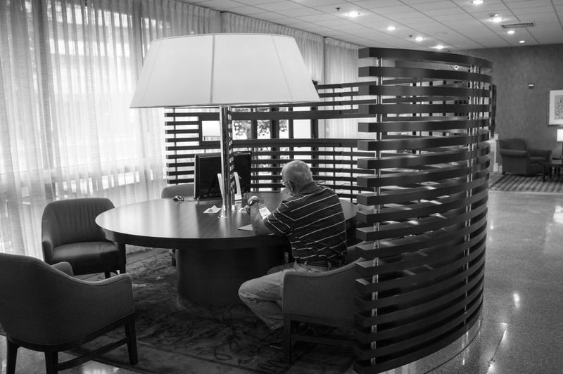 The photograph captures an elderly man seated at a circular desk, engaged with his thoughts in a softly lit lobby space. The striped partition adds a sense of intimacy, while the surrounding furnishings create a calm, contemplative atmosphere. The monochrome palette enhances the mood of solitude and reflection, inviting viewers to ponder the man's quiet moment amidst a bustling world.