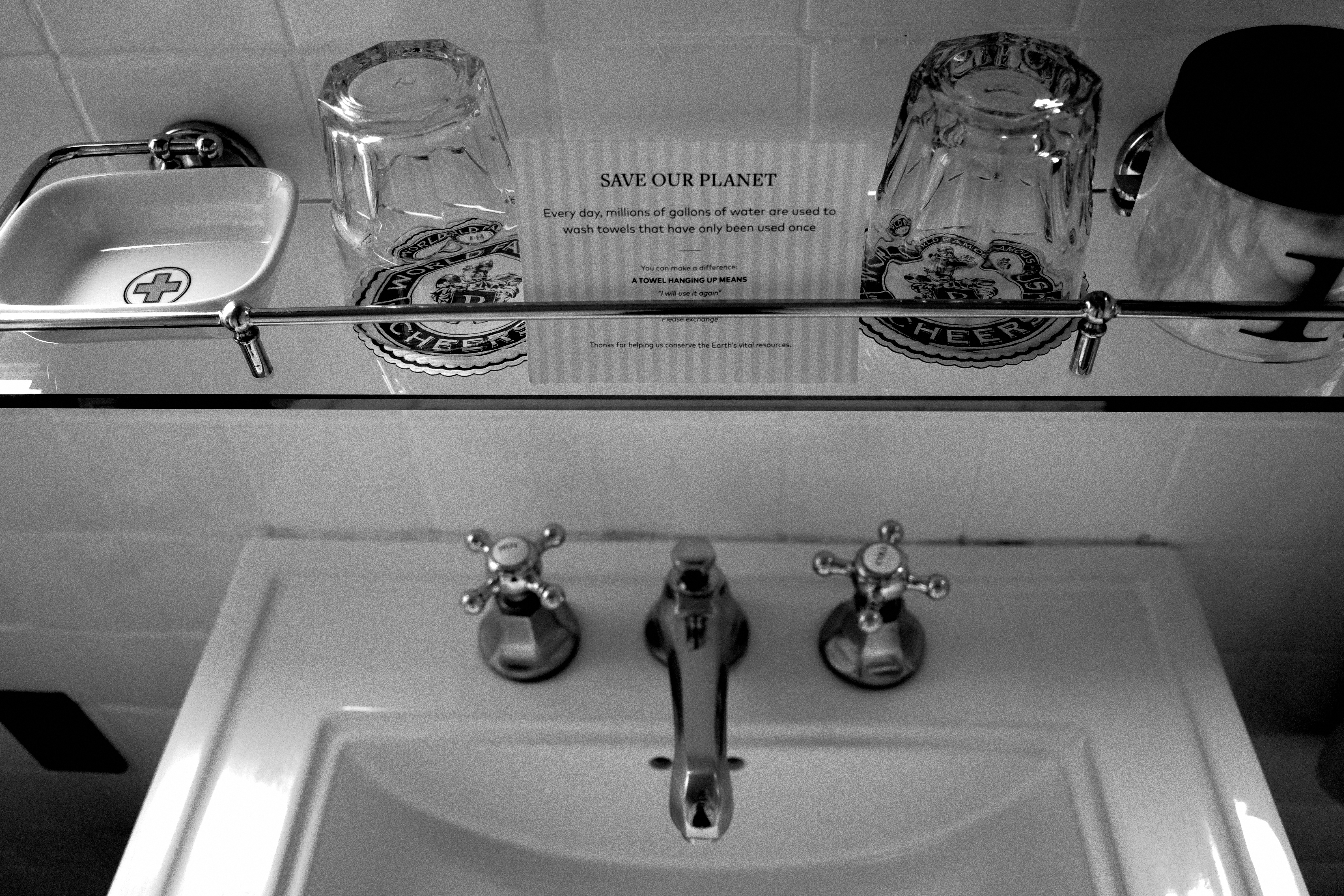 The photograph captures a minimalist bathroom scene, emphasizing sustainability through a neatly arranged sink area. A sign urges guests to conserve water, thoughtfully positioned alongside glassware and a stylish mug, all under soft lighting that exudes a calm and contemplative mood. The black and white composition enhances the cleanliness and simplicity of the setting, drawing attention to the eco-conscious message.
