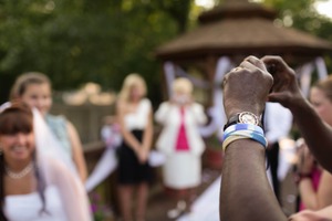 The photograph captures a joyful moment during a wedding ceremony, showcasing the excitement of guests as they gather to witness the event. The focus is on a hand holding a camera, emphasizing the act of capturing memories, while the blurred background reveals happy faces in elegant attire, bathed in soft, natural lighting that enhances the celebratory mood. Overall, the composition conveys a sense of intimacy and festivity that is characteristic of such special occasions.