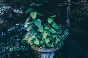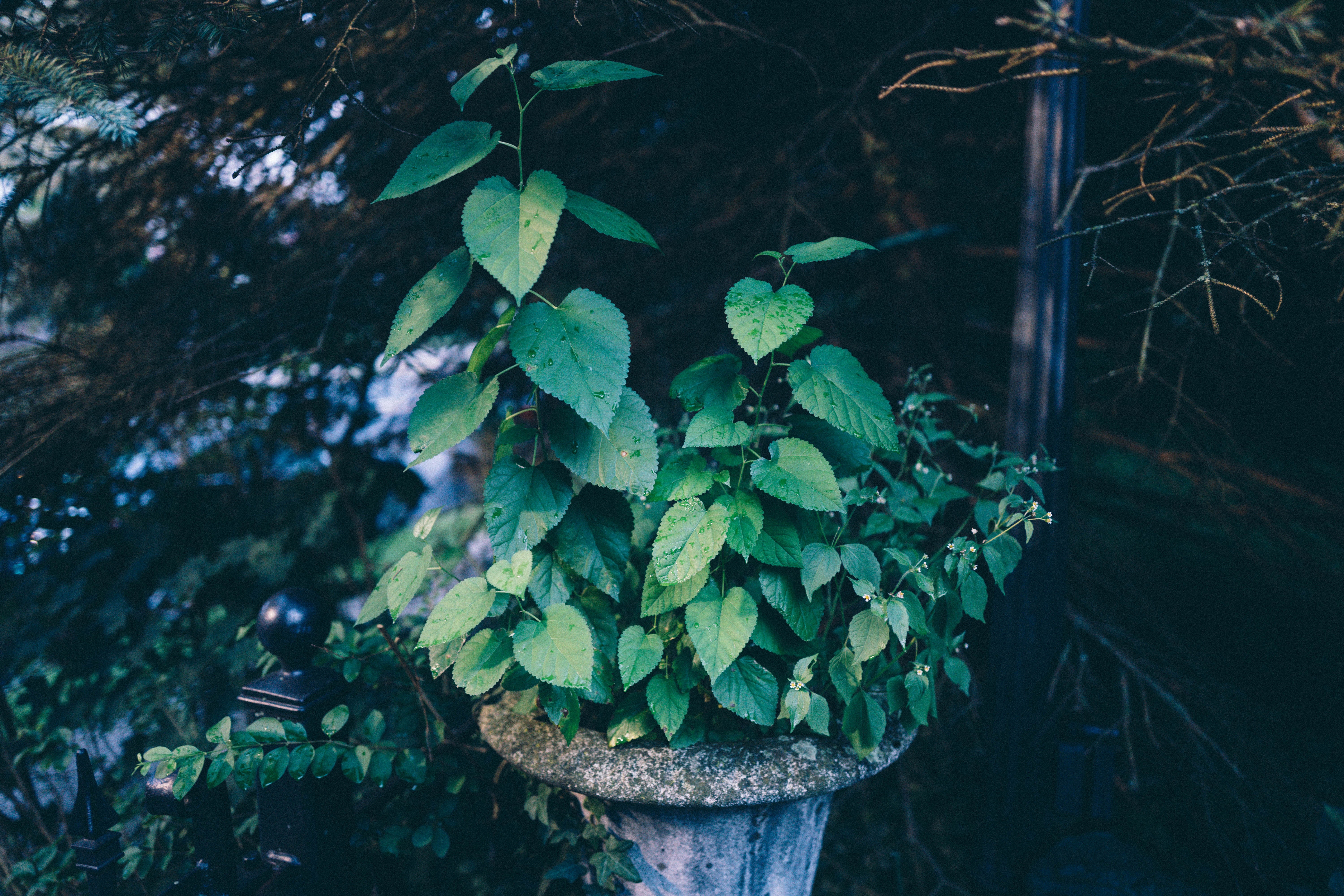 Amidst the shadows of dense foliage, a crown of vibrant greenery emerges from a weathered stone pot. The soft, diffused light casts gentle highlights on the lush leaves, creating a tranquil yet lively atmosphere. This composition evokes a sense of quiet persistence, where nature thrives even in overlooked spaces.
