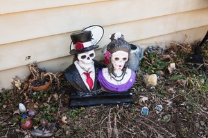 Two brightly painted skeleton figures stand side by side in a garden, exuding a playful yet eerie charm. Surrounded by dry grass and scattered decorations, the warm sunlight casts soft shadows, enhancing their colorful attire against the muted backdrop of a wooden wall. This quirky vignette evokes a sense of celebration and remembrance, combining elements of whimsy with the macabre.