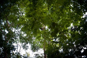 This photograph captures an intricate view of a lush green canopy, where dense foliage creates a vibrant tapestry against the sky. The soft, dappled light filters through the leaves, casting a serene and tranquil mood, inviting a sense of peace and connection with nature. The upward perspective emphasizes the towering trees, evoking a feeling of wonder as one gazes into the heart of the forest.
