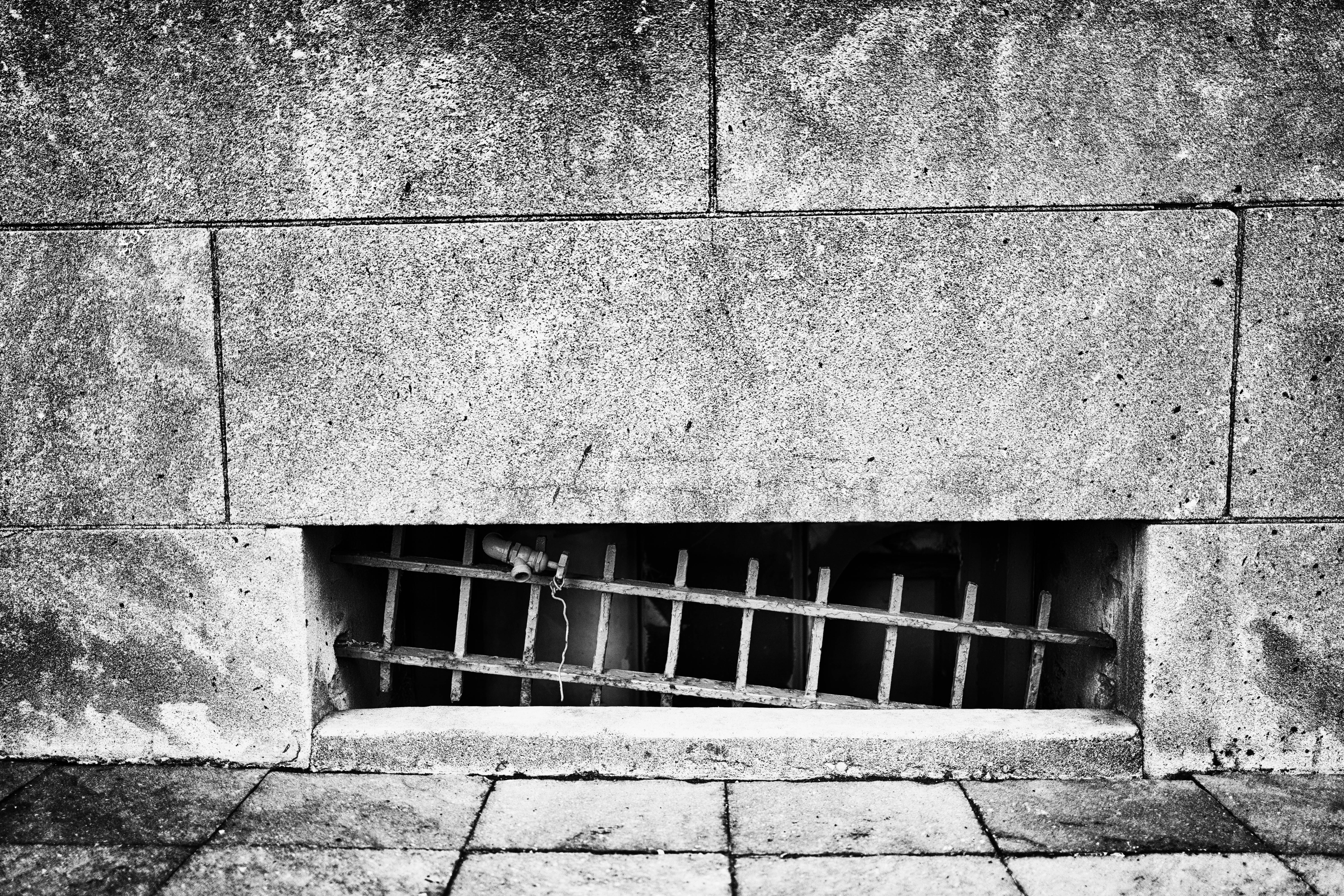 This photograph captures a stark, monochromatic scene of a concrete wall featuring a barred opening that hints at a hidden, darker space beyond. The mood is one of confinement and curiosity, accentuated by the harsh lighting that highlights the textures of the stone and the rusted grate. The composition draws the eye to the intriguing interplay of light and shadow, evoking themes of entrapment and the unknown.