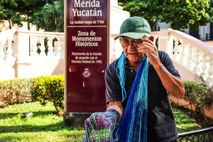 An elderly man stands against a vibrant historical backdrop, clutching colorful woven material. The warm sunlight casts a soft glow on his weathered face, conveying a sense of nostalgia and wisdom. The contrasting hues of his attire and the rich reds of the sign evoke a lively connection to the culture and traditions of Mérida, Yucatán.