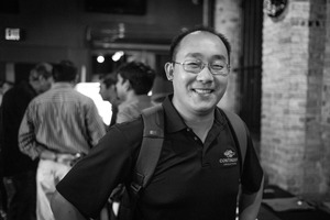 In a lively gathering, a smiling man stands confidently in the foreground, radiating warmth and approachability. The soft focus and muted tones of the background, populated by blurred figures, enhance the intimate yet energetic mood of the event. Subtle lighting captures the subtle nuances of the scene, inviting a sense of camaraderie among the attendees.