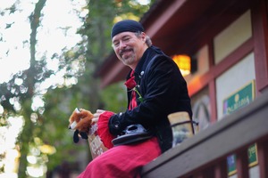 The photograph captures a jovial man sitting on a wooden railing, playfully holding a stuffed fox and showcasing a bright red rose. With a backdrop of soft green foliage and warm, dappled sunlight, a cheerful yet relaxed atmosphere radiates. His attire, a blend of pirate and whimsical elements, adds to the charm and character of the scene.