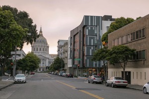 This photograph captures a tranquil street scene in an urban setting, with historic architecture meeting modern design. The soft, fading light of dusk casts gentle shadows, highlighting the ornate dome of the building in the background, while the foreground blends the old and new with sleek lines and greenery. A serene, inviting mood permeates the composition, inviting viewers to explore the architectural contrasts and warm colors of the evening sky.
