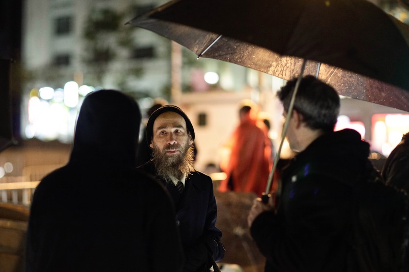 The photograph captures an intimate moment between three individuals engaged in conversation under the glow of urban lights. The warm illumination contrasts with the dark, rainy atmosphere, creating a sense of shelter amidst the night. Their expressions and postures convey a mixture of curiosity and contemplation, inviting viewers into their dialogue.