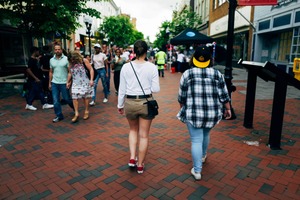 The photograph captures a bustling city street where a diverse crowd of pedestrians strolls leisurely, embodying a vibrant urban atmosphere. Two figures in the foreground, a woman in shorts and a casual white top paired with a friend in a plaid shirt and cap, walk side by side, allowing viewers to sense their camaraderie. Soft, diffused lighting complements the overcast skies, creating a moody yet inviting vibe for a day of exploration.