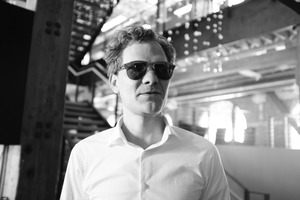 The photograph features a man with tousled hair, wearing sunglasses and a white shirt, exuding an air of calm confidence. Set against a backdrop of industrial architecture, the interplay of shadows and light creates a striking mood, emphasizing both modernity and introspection. The black and white composition adds depth, drawing attention to the subject's focused expression and stylish demeanor.