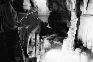 The photograph captures a solitary figure standing on a railing, gazing thoughtfully into the depths of a cavernous space. Bathed in soft light, the interplay of shadows and reflections creates an ethereal atmosphere, inviting a sense of wonder and contemplation. The cool tones and textures of the stalactites and rocky formations evoke a serene yet mysterious mood, enhancing the enchantment of the underground world.