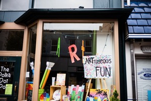 The photograph captures a lively storefront adorned with colorful signs proclaiming 'ART' and 'ART-rageous FUN'. The playful arrangement of art supplies and bright signage creates a cheerful and inviting atmosphere, enhanced by the soft, diffused natural light filtering through the windows.