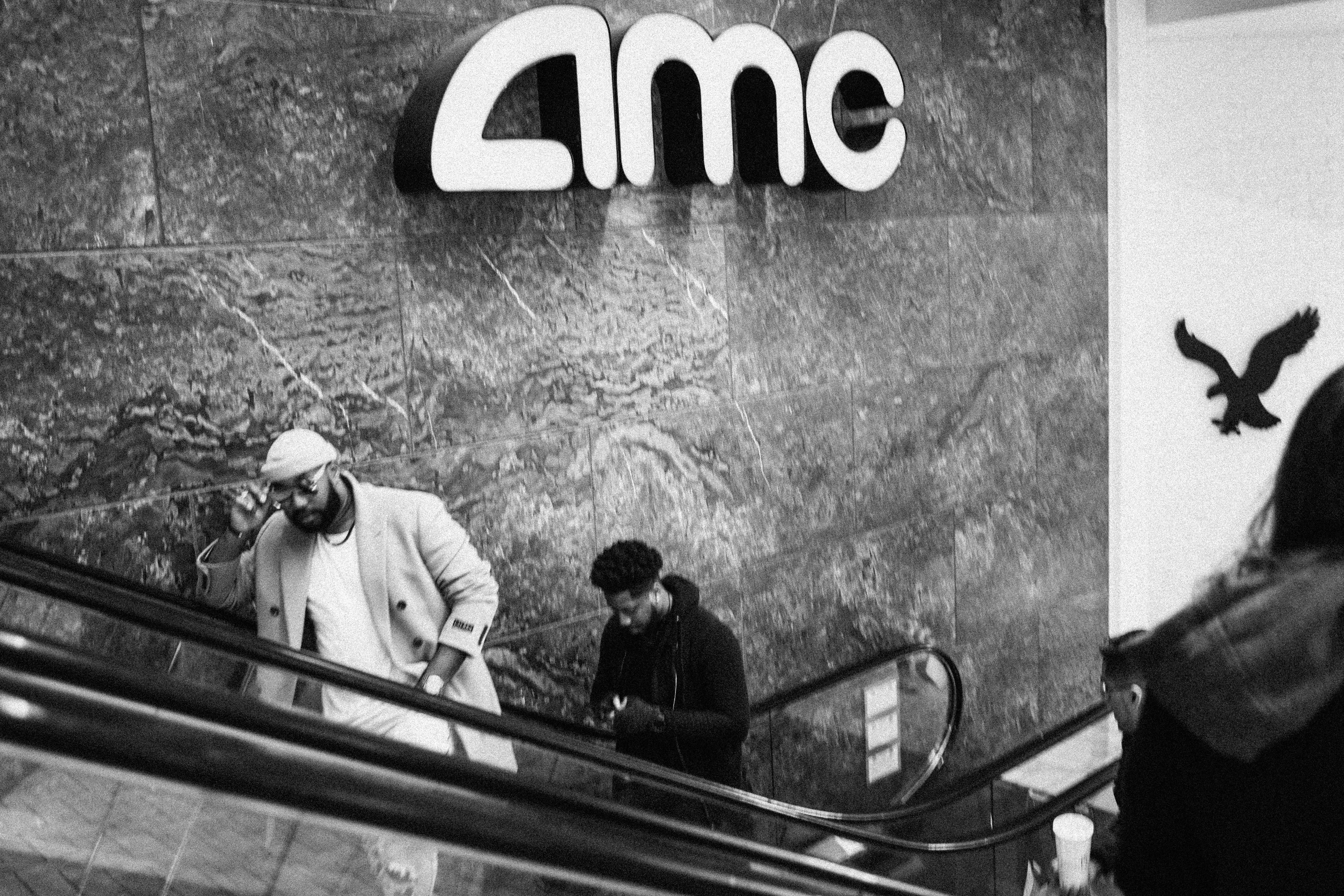 In this black-and-white photograph, two men descend an escalator beneath the bold 'AMC' sign, capturing a moment of casual urban life. The composition emphasizes movement and depth, with the men partially obscured and their expressions hinting at introspection or conversation. The subdued lighting and monochromatic tones create a moody, contemplative atmosphere, evoking the hustle and bustle of a busy city.